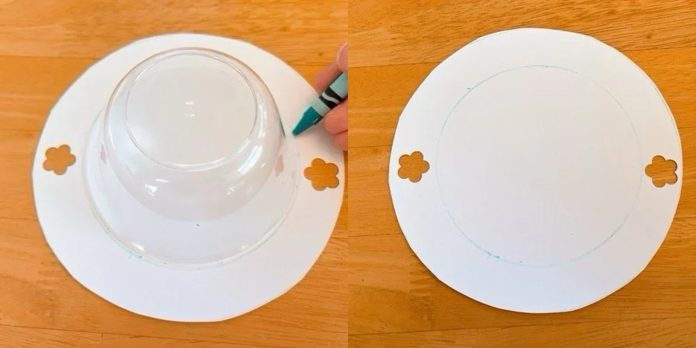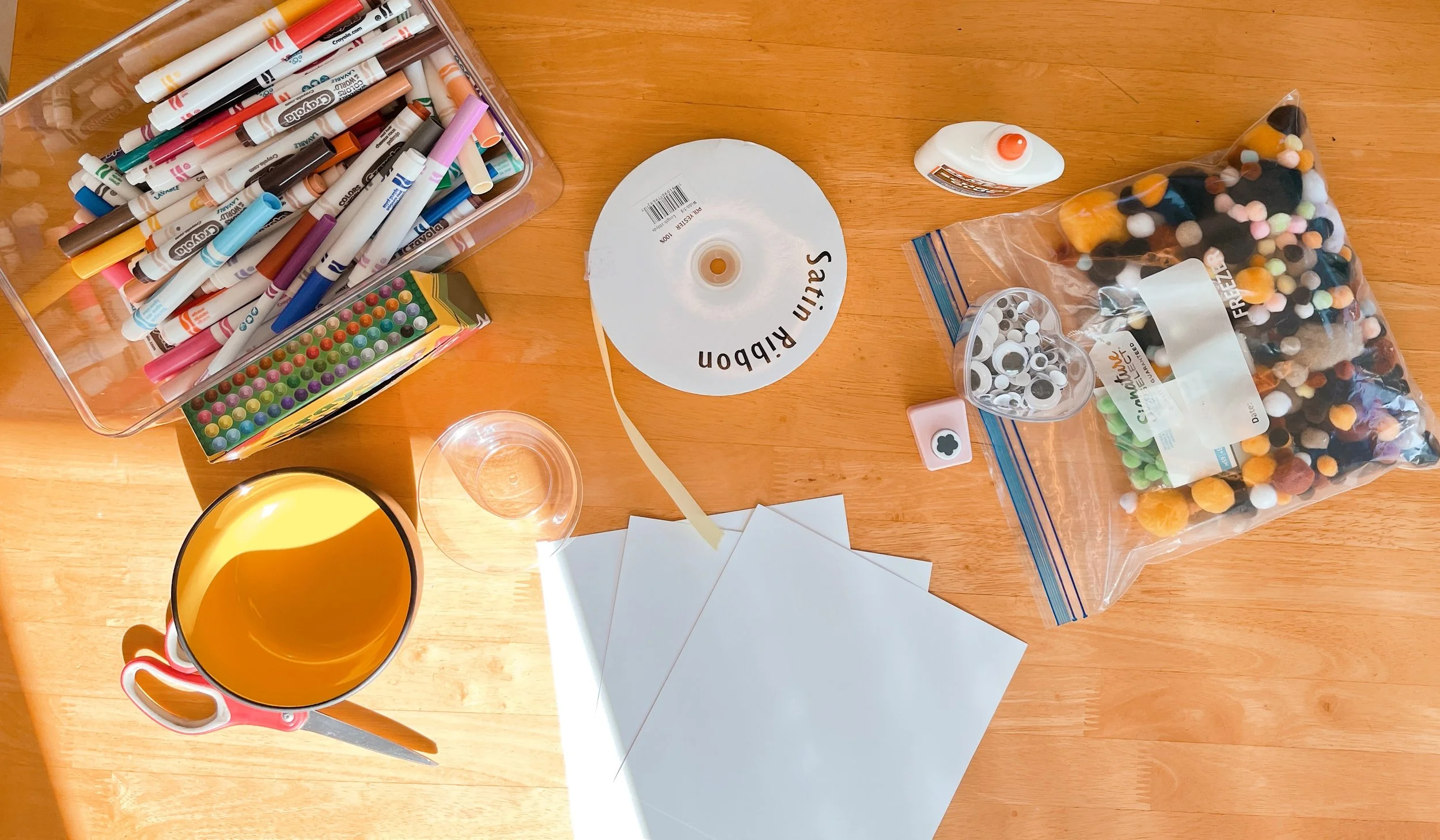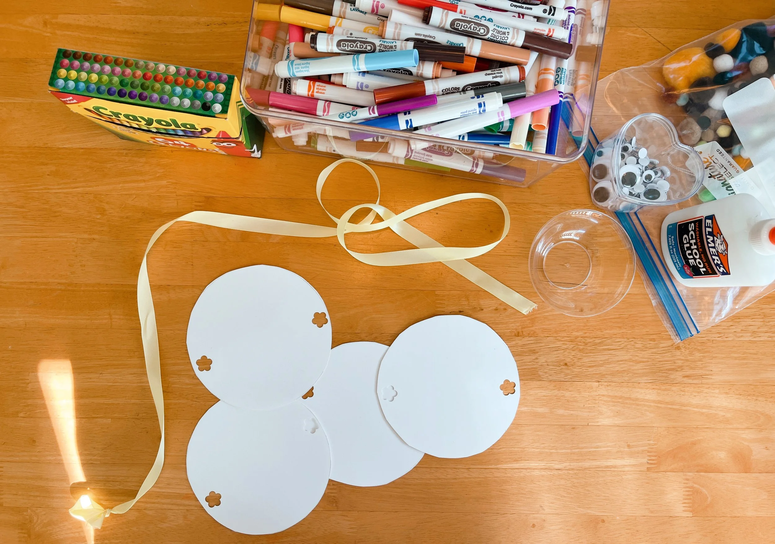 Gather the crayons, markers, ribbon, paper, and small bowl for your child.