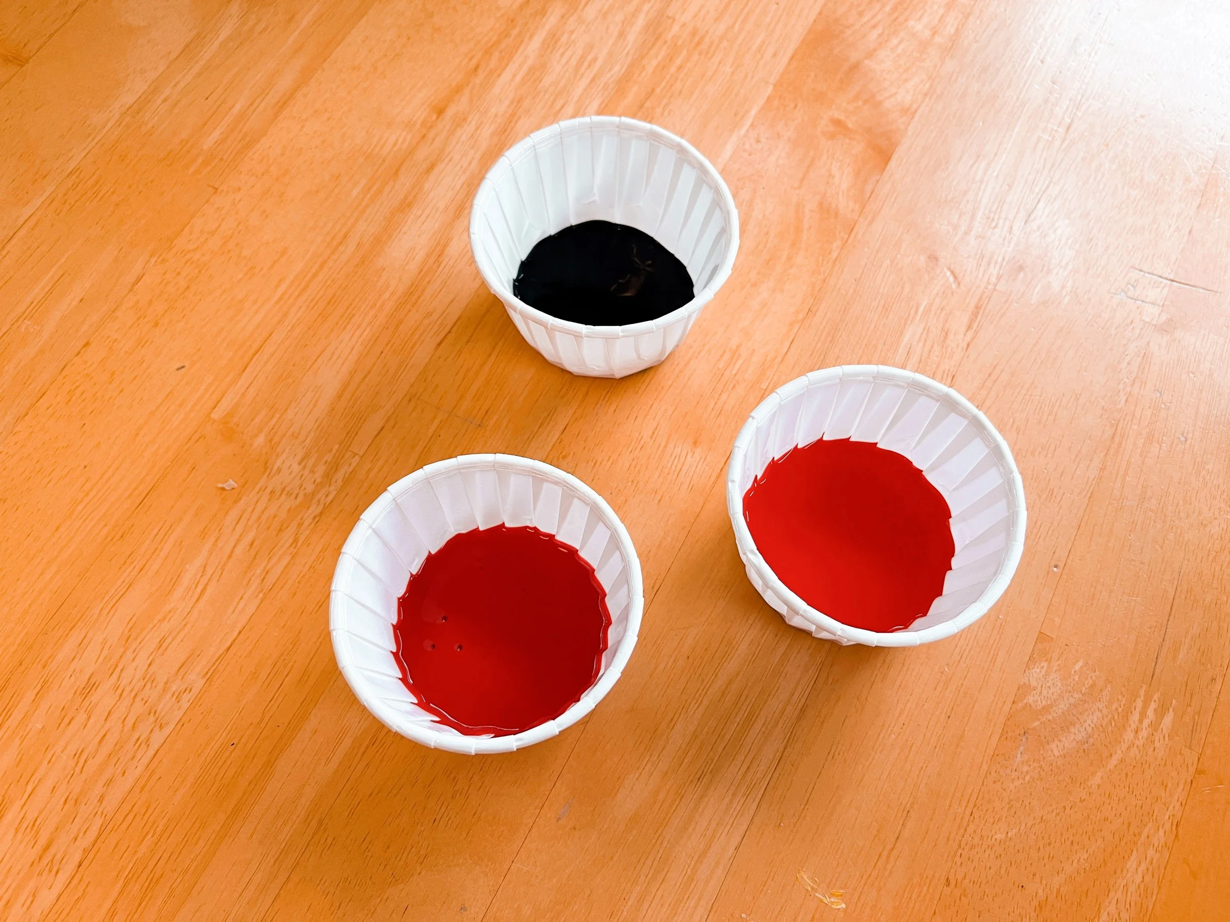 Pour the black and red paint in different cups. It’s fun to have different shades of red!