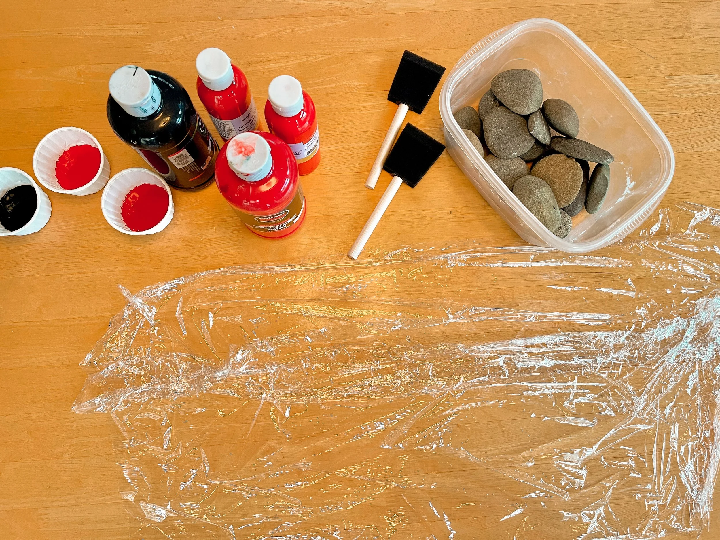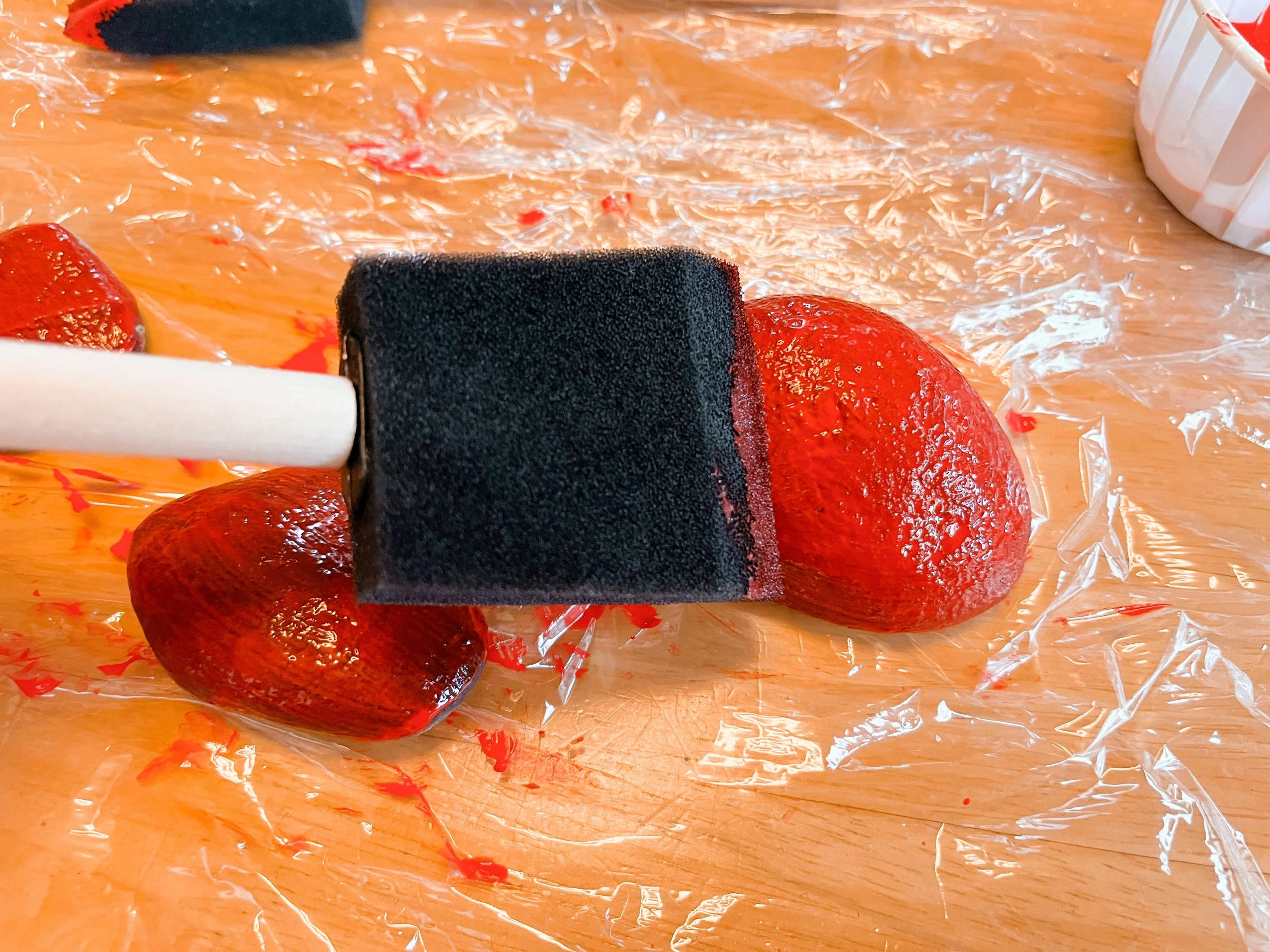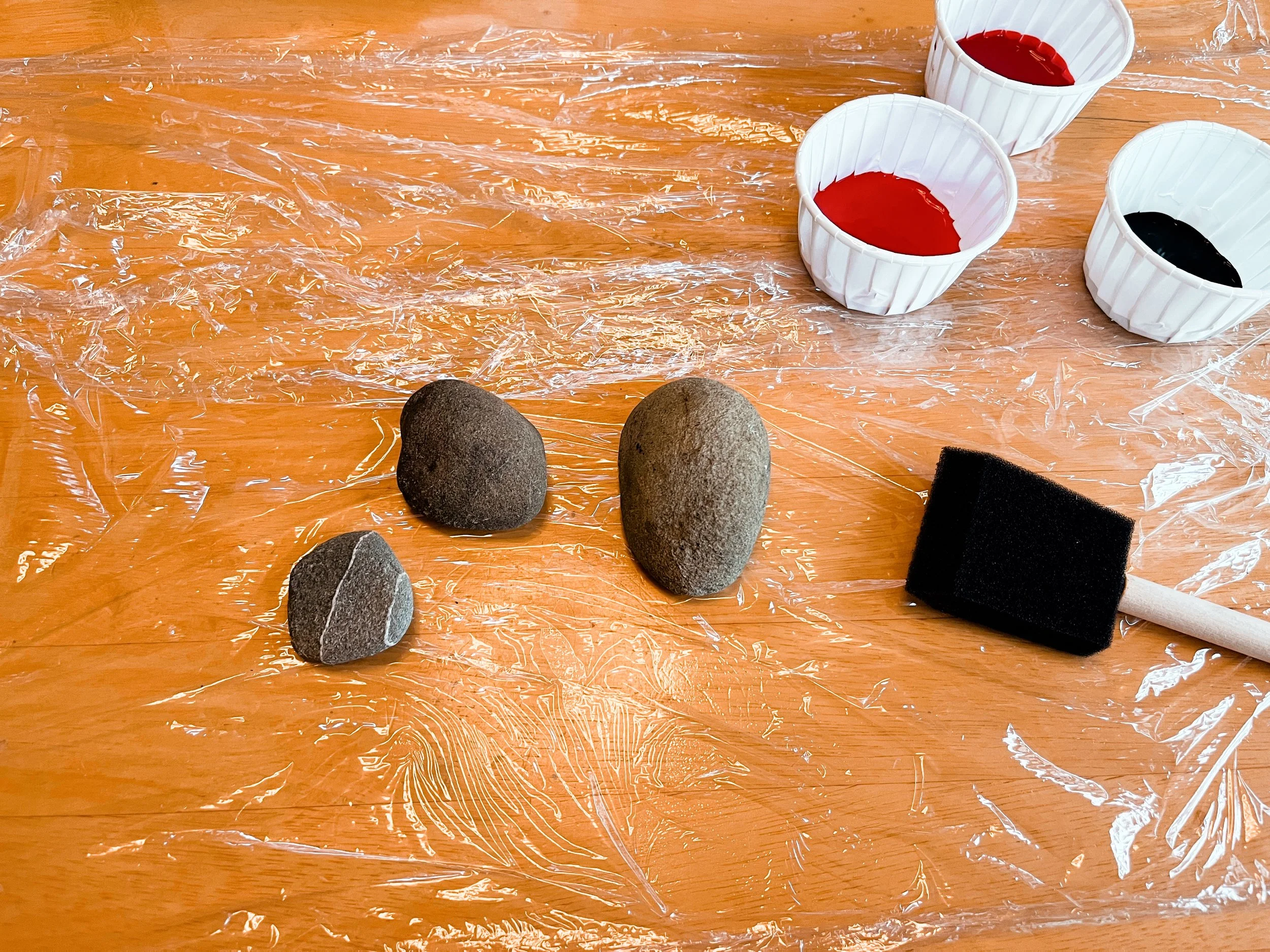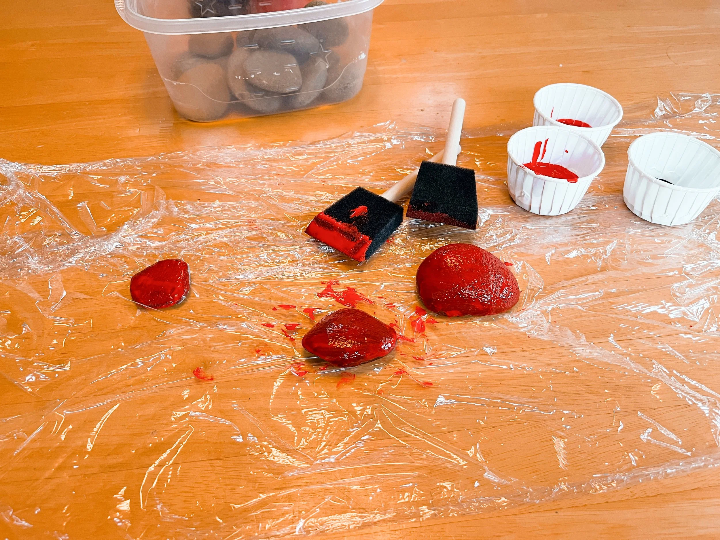 The sponge brushes are used to create an even coat of red paint on one side of the rocks.