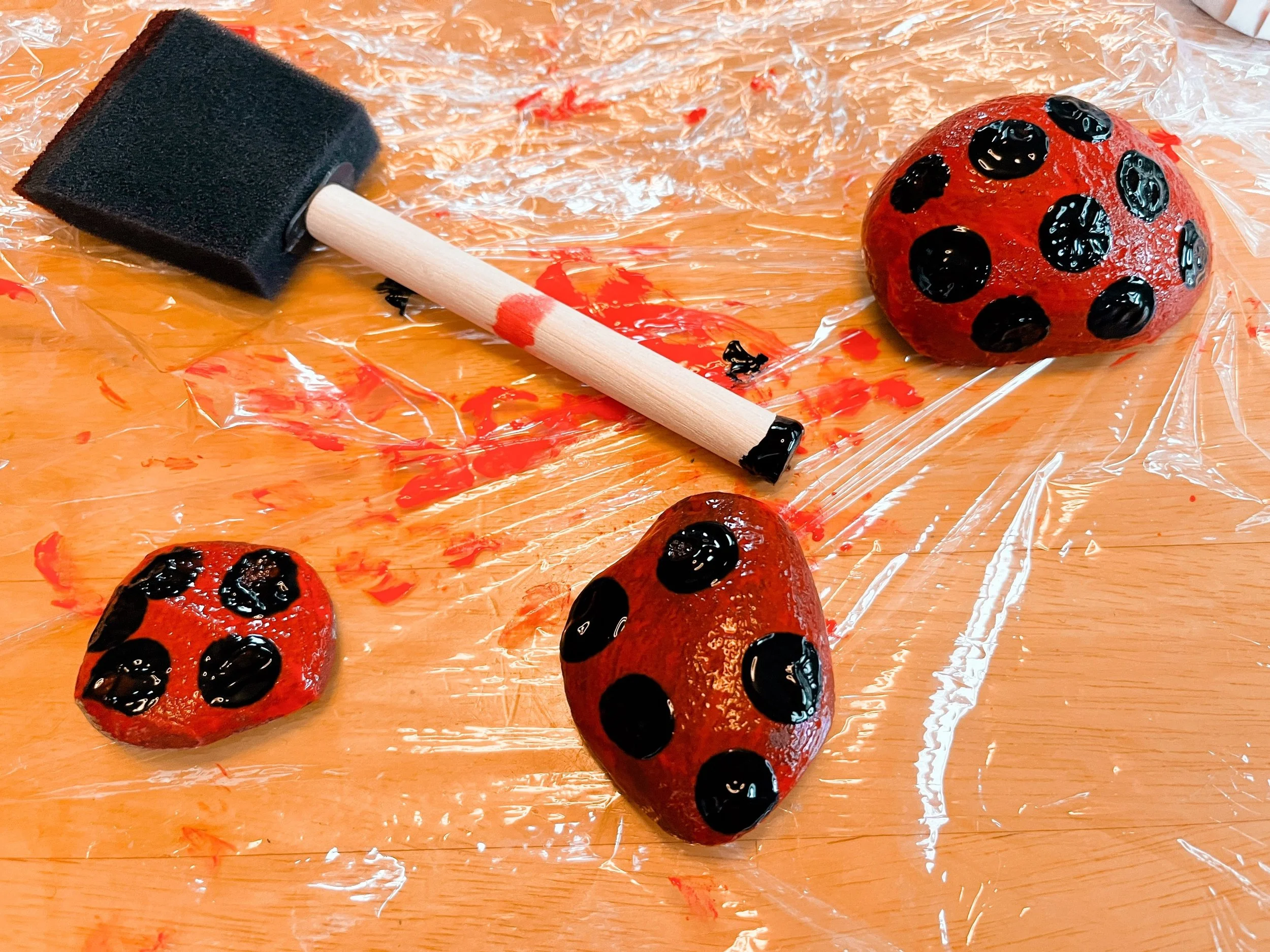 The back side of the sponge brush, or some wooden dowels can be used to make the dots on the back of the ladybug.