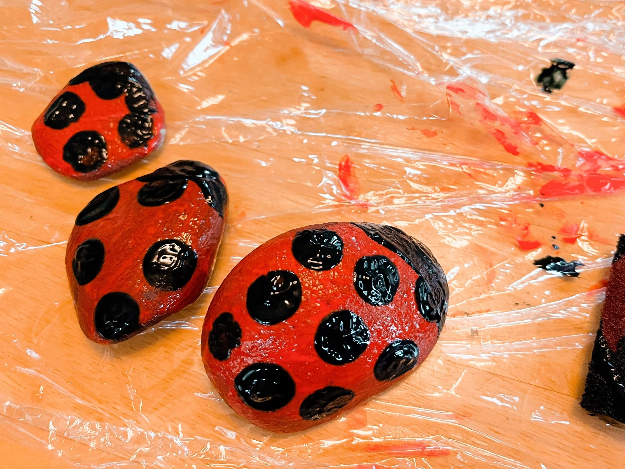 The sponge brush can be used again to paint one corner of the rock black to create the ladybug’s head.